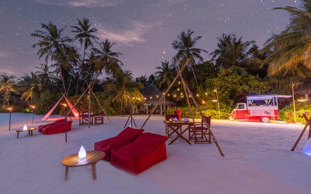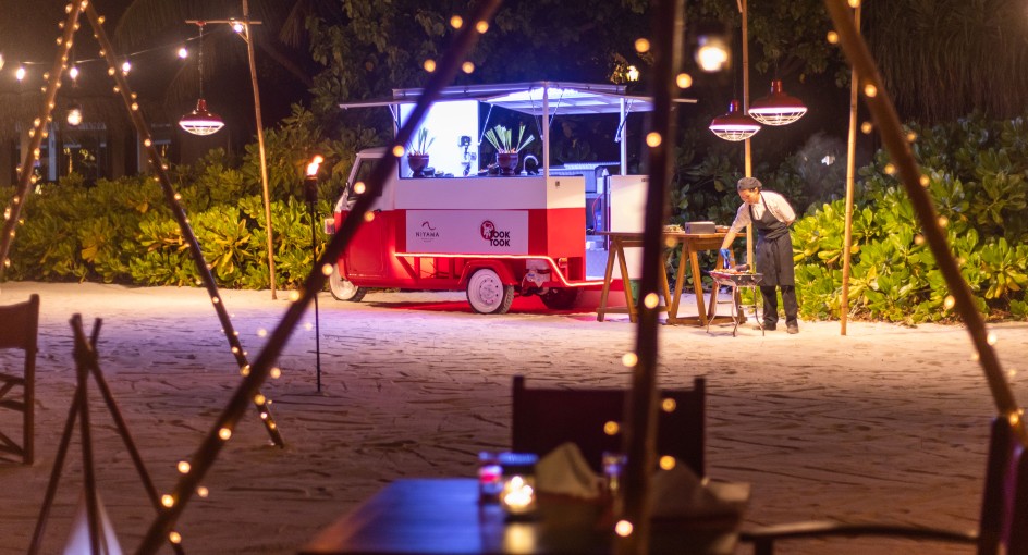 Asian street food in Maldives on the beach, carefully prepared and grilled over coals by Niyama’s chefs at Took Took, the resort’s once-a-week, destination dining concept. Bamboo teepee frames draped in fairy lights and hurricane lamps tower over a lounging and dining area set-up beneath the open sky. Relax in snug beach armchairs with toes in the sand, while enjoying coral painted sunsets, glasses of bubbly, and creatively presented street food.