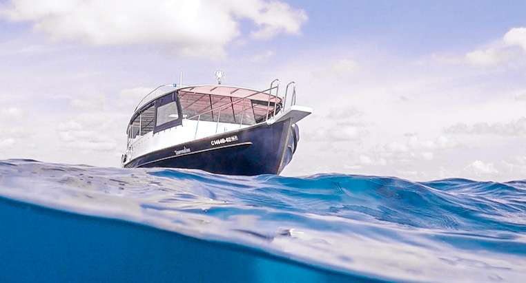 透过玻璃底的皮划艇,凝望碧蓝的海水。驾驶水下摩托艇以每小时20公里的速度在水下疾驰,再冲出水面。在海岛尾部冲浪,那里是中高级潜水者的完美地点。