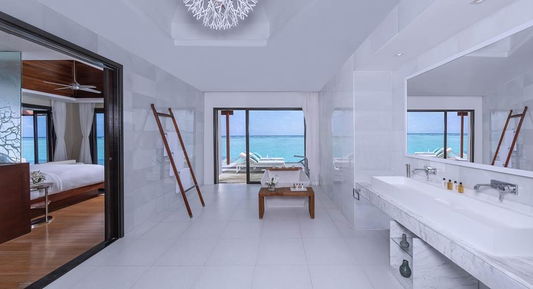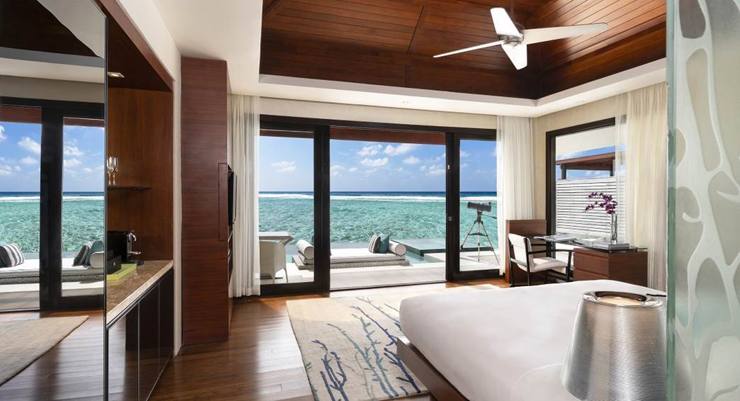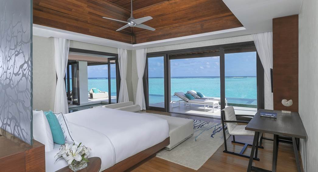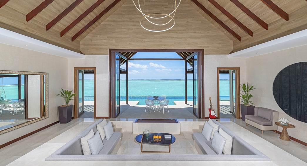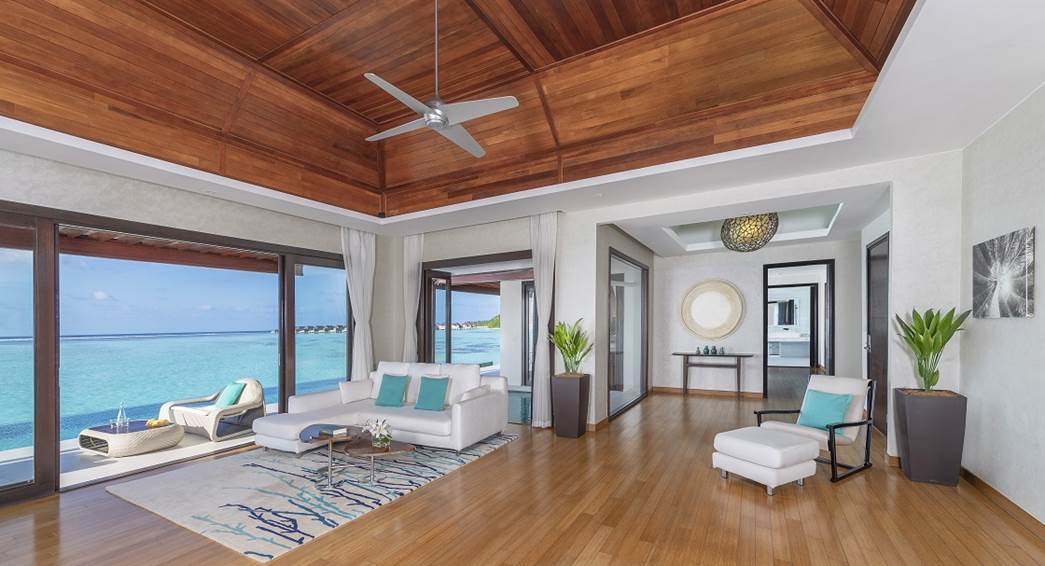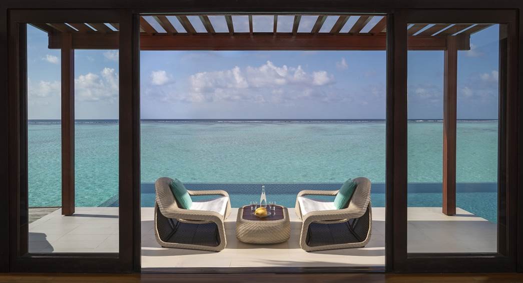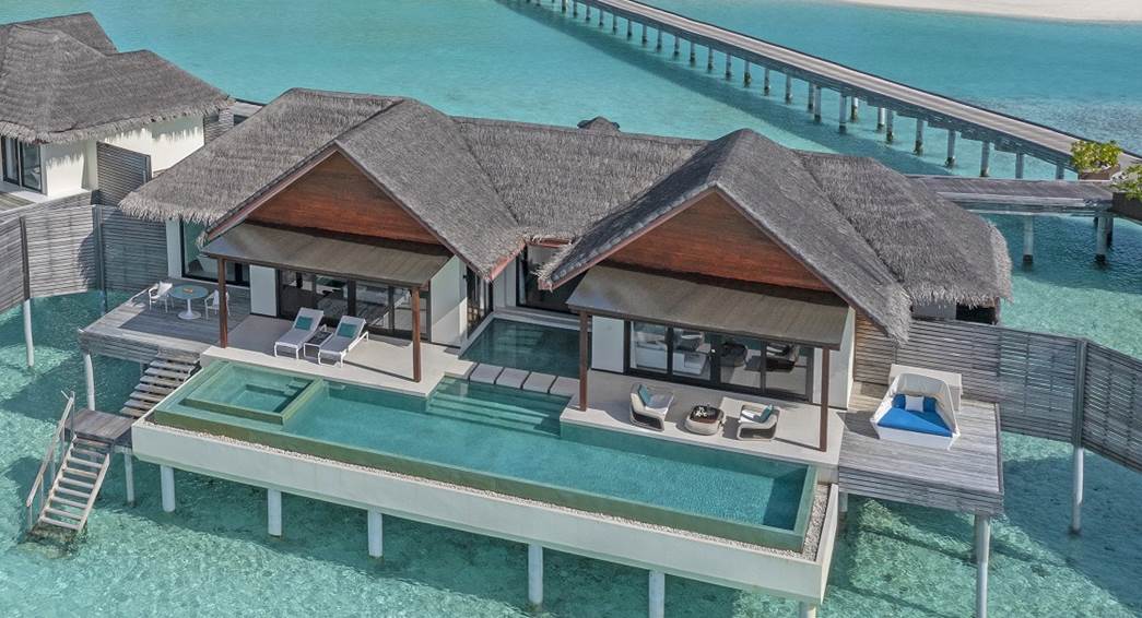 尽享广袤天地。新月湾的中心是一栋两卧室海景泳池别墅,两侧分别是两栋一卧室水上别墅和两栋豪华水上小屋,所有五栋别墅皆拥有私人泳池。两位专职私人别墅管家和一位管家,确保您的岛屿绿洲顺利运转。
